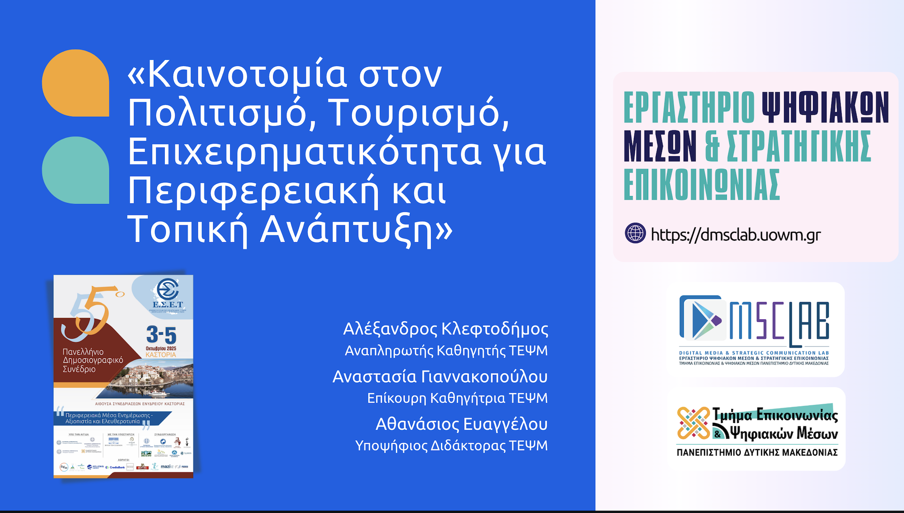 Στο 55ο Πανελλήνιο Δημοσιογραφικό Συνέδριο που διοργάνωσε η Ένωση Συντακτών Επαρχιακού Τύπου, στην Καστοριά, το Εργαστήριο Ψηφιακών Μέσων και Στρατηγικής Επικοινωνίας είχε παρουσίαση με κεντρικό θέμα: «Καινοτομία στον Πολιτισμό, Τουρισμό, Επιχειρηματικότητα για Περιφερειακή και Τοπική Ανάπτυξη», από τους: Αλέξανδρο Κλεφτοδήμο, Αν. Καθηγητής ΤΕΨΜ, Αναστασία Γιαννακοπούλου, Επικ. Καθηγήτρια ΤΕΨΜ, και Αθανάσιο Ευαγγέλου, Υποψήφιο Διδάκτορα ΤΕΨΜ.