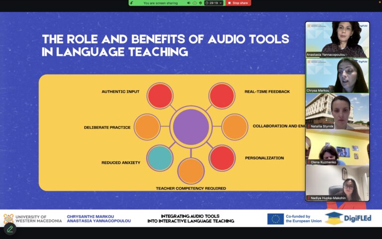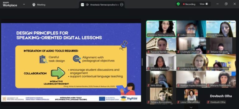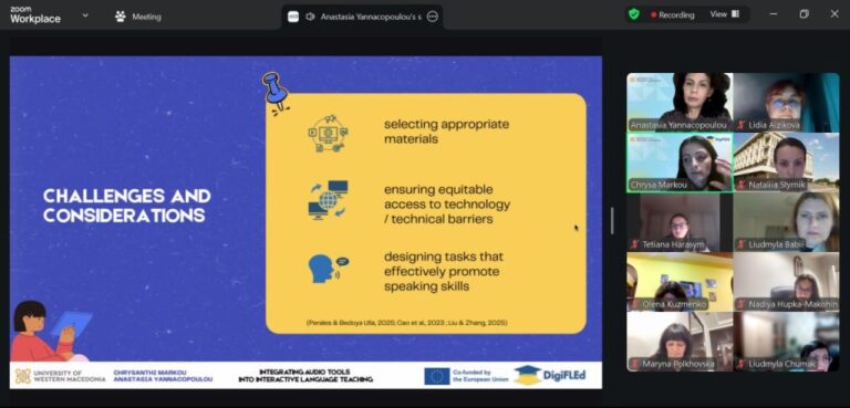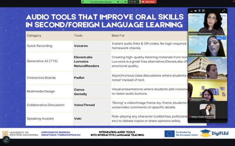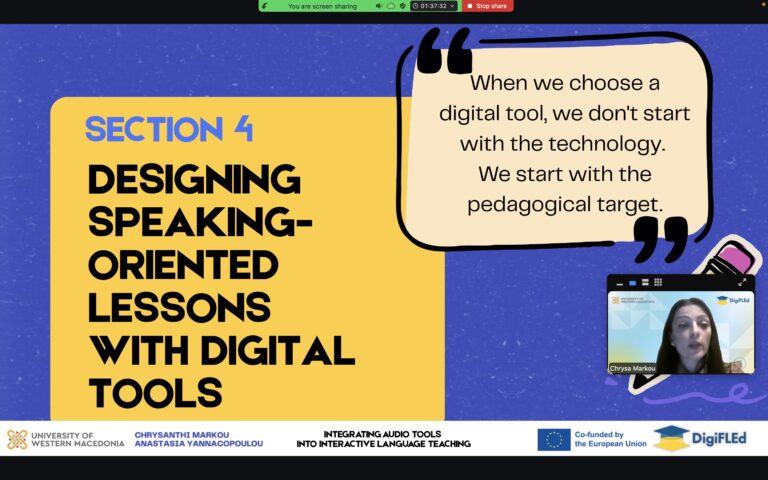 Πώς μπορούν τα ψηφιακά εργαλεία ήχου να υποστηρίξουν ουσιαστική προφορική εξάσκηση στη διδασκαλία γλωσσών σε ψηφιακά περιβάλλοντα; Το ερώτημα αυτό βρέθηκε στο επίκεντρο του διαδικτυακού σεμιναρίου (webinar) «Integrating Audio Tools into Interactive Language Teaching: Designing Speaking-Oriented Digital Lessons» («Εργαλεία ήχου στη διαδραστική διδασκαλία γλωσσών: σχεδιασμός μαθημάτων με ψηφιακά μέσα με έμφαση στον προφορικό λόγο»), το οποίο πραγματοποιήθηκε στις 27 Ιανουαρίου 2026, στο πλαίσιο του ευρωπαϊκού έργου Erasmus+ DigiFLEd.