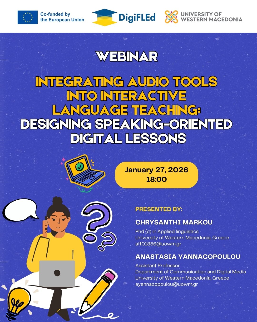 Πώς μπορούν τα ψηφιακά εργαλεία ήχου να υποστηρίξουν ουσιαστική προφορική εξάσκηση στη διδασκαλία γλωσσών σε ψηφιακά περιβάλλοντα; Το ερώτημα αυτό βρέθηκε στο επίκεντρο του διαδικτυακού σεμιναρίου (webinar) «Integrating Audio Tools into Interactive Language Teaching: Designing Speaking-Oriented Digital Lessons» («Εργαλεία ήχου στη διαδραστική διδασκαλία γλωσσών: σχεδιασμός μαθημάτων με ψηφιακά μέσα με έμφαση στον προφορικό λόγο»), το οποίο πραγματοποιήθηκε στις 27 Ιανουαρίου 2026, στο πλαίσιο του ευρωπαϊκού έργου Erasmus+ DigiFLEd.