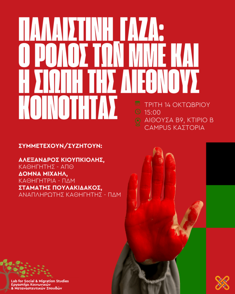 Το Εργαστήριο Κοινωνικών και Μεταναστευτικών Σπουδών της Σχολής Κοινωνικών και Ανθρωπιστικών Επιστημών του Πανεπιστημίου Δυτικής Μακεδονίας σάς προσκαλεί σε ανοικτή εδήλωση με τίτλο «Παλαιστίνη/Γάζα: Γενοκτονία,...