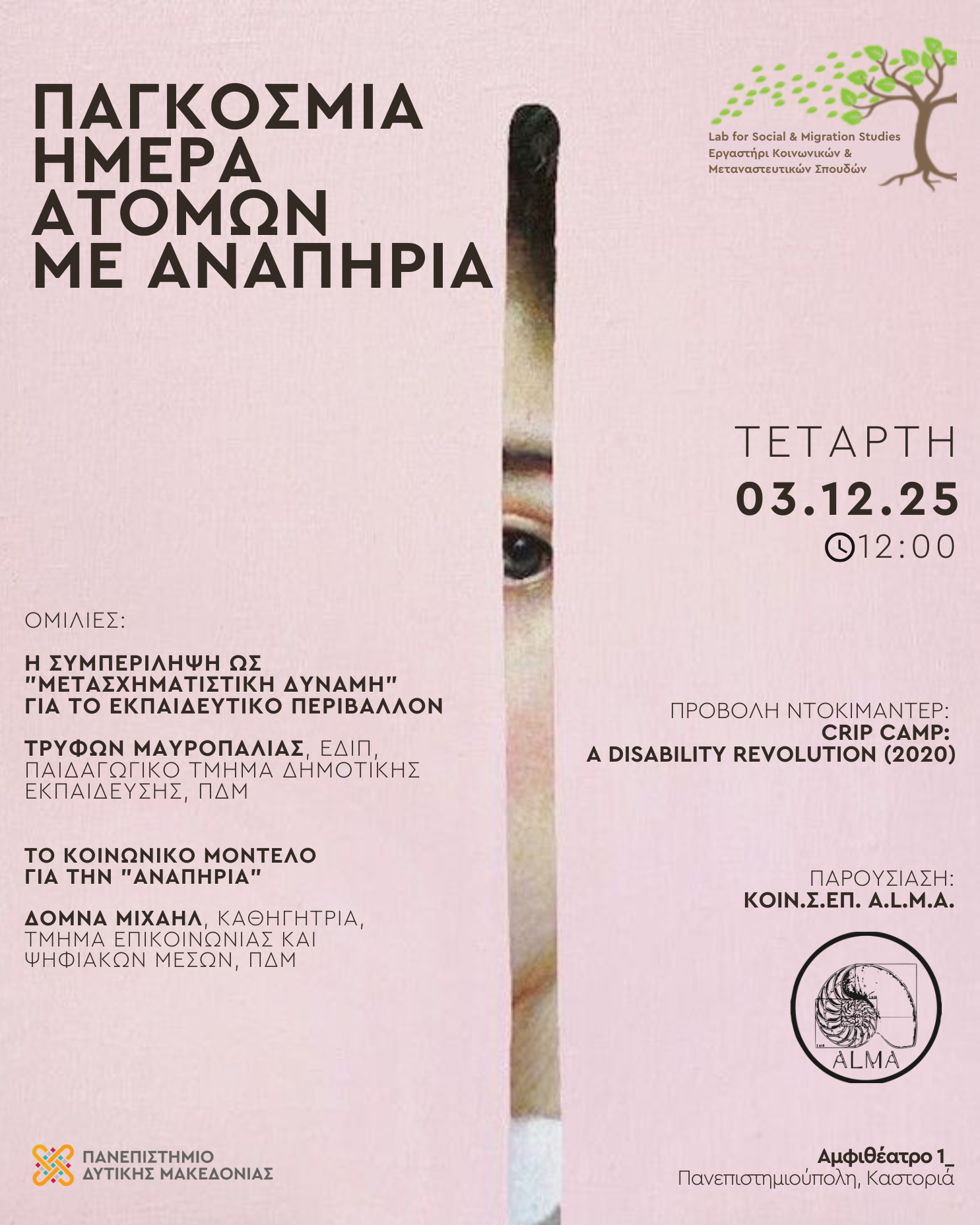 Το Εργαστήριο Κοινωνικών & Μεταναστευτικών Σπουδών διοργανώνει μια εκδήλωση αφιερωμένη στη συμπερίληψη, τα δικαιώματα και τις σύγχρονες προσεγγίσεις γύρω από την αναπηρία. Μια ημέρα-υπενθύμιση ότι η ισότητα δεν είναι θεωρία, αλλά πράξη.