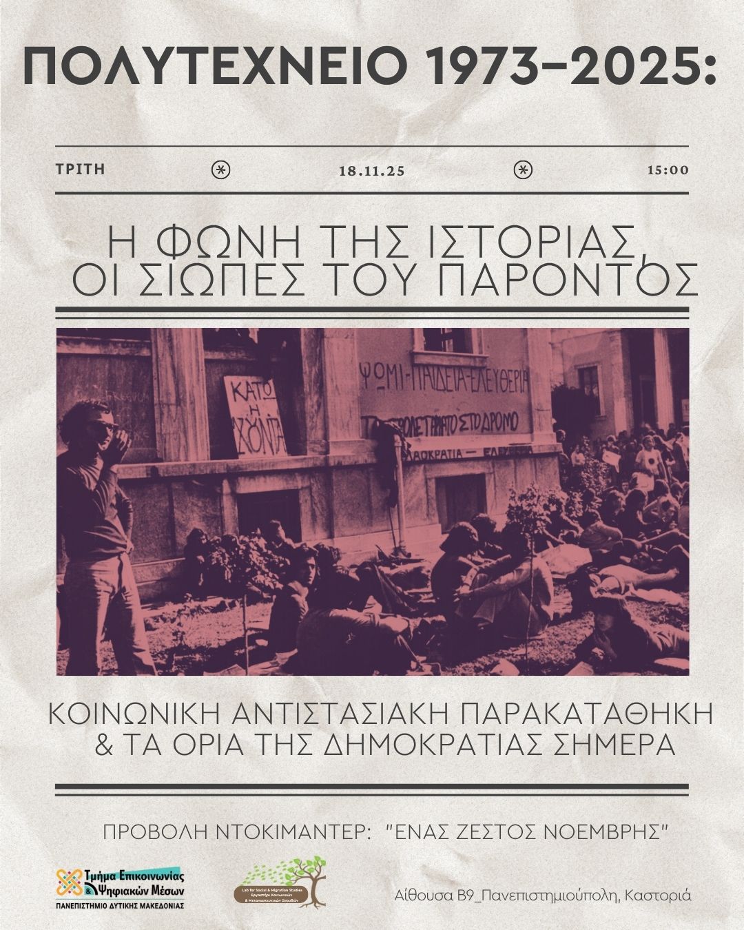 Την Τρίτη, 18 Νοεμβρίου 2025, ώρα 15:00, στην Αίθουσα Β9 του Πανεπιστημίου Δυτικής Μακεδονίας στην Καστοριά, θα πραγματοποιηθεί εκδήλωση μνήμης για τα 52 χρόνια από την Εξέγερση του Πολυτεχνείου με τίτλο: