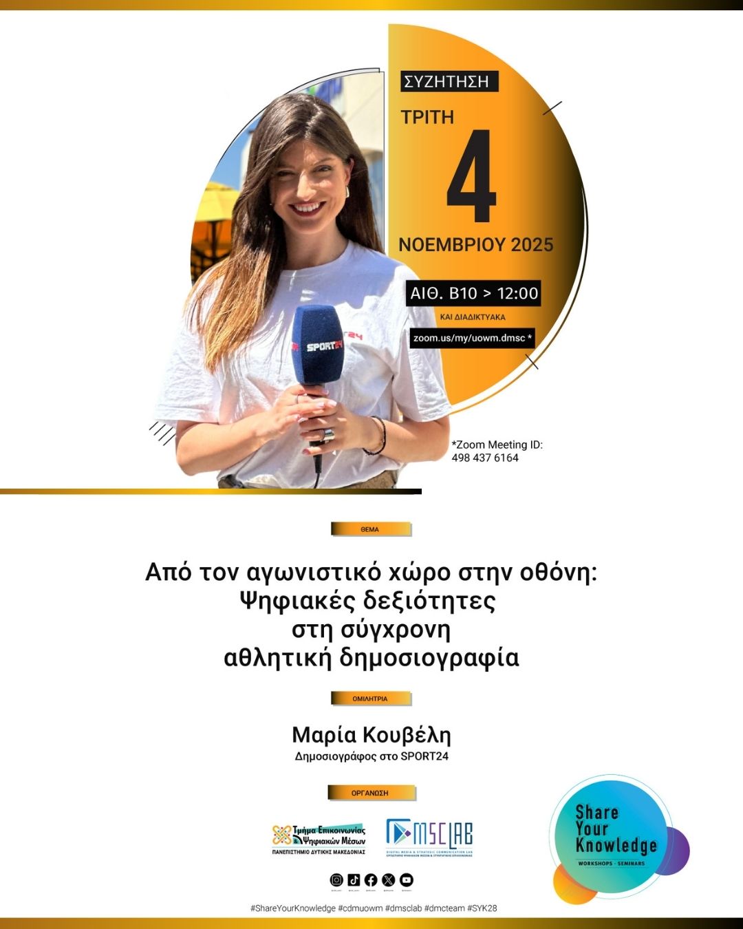 Share Your Knowledge – Μοιράσου τη γνώση σου. Ένας κύκλος σεμιναρίων και εργαστηρίων (workshops) που διοργανώνουν το Εργαστήριο Ψηφιακών Μέσων και Στρατηγικής Επικοινωνίας #dmsclab του Τμήματος Επικοινωνίας και Ψηφιακών Μέσων #cdmuowm και η Ομάδα Επικοινωνίας #dmcteam, με στόχο να φέρουμε κοντά μας επαγγελματίες και ακαδημαϊκούς του χώρου της επικοινωνίας και των ψηφιακών μέσων για να μοιραστούν τις γνώσεις τους μαζί μας. Τα σεμινάρια απευθύνονται σε όλους τους ενδιαφερόμενους φοιτητές και το ακαδημαϊκό προσωπικό του Πανεπιστημίου Δυτικής Μακεδονίας.