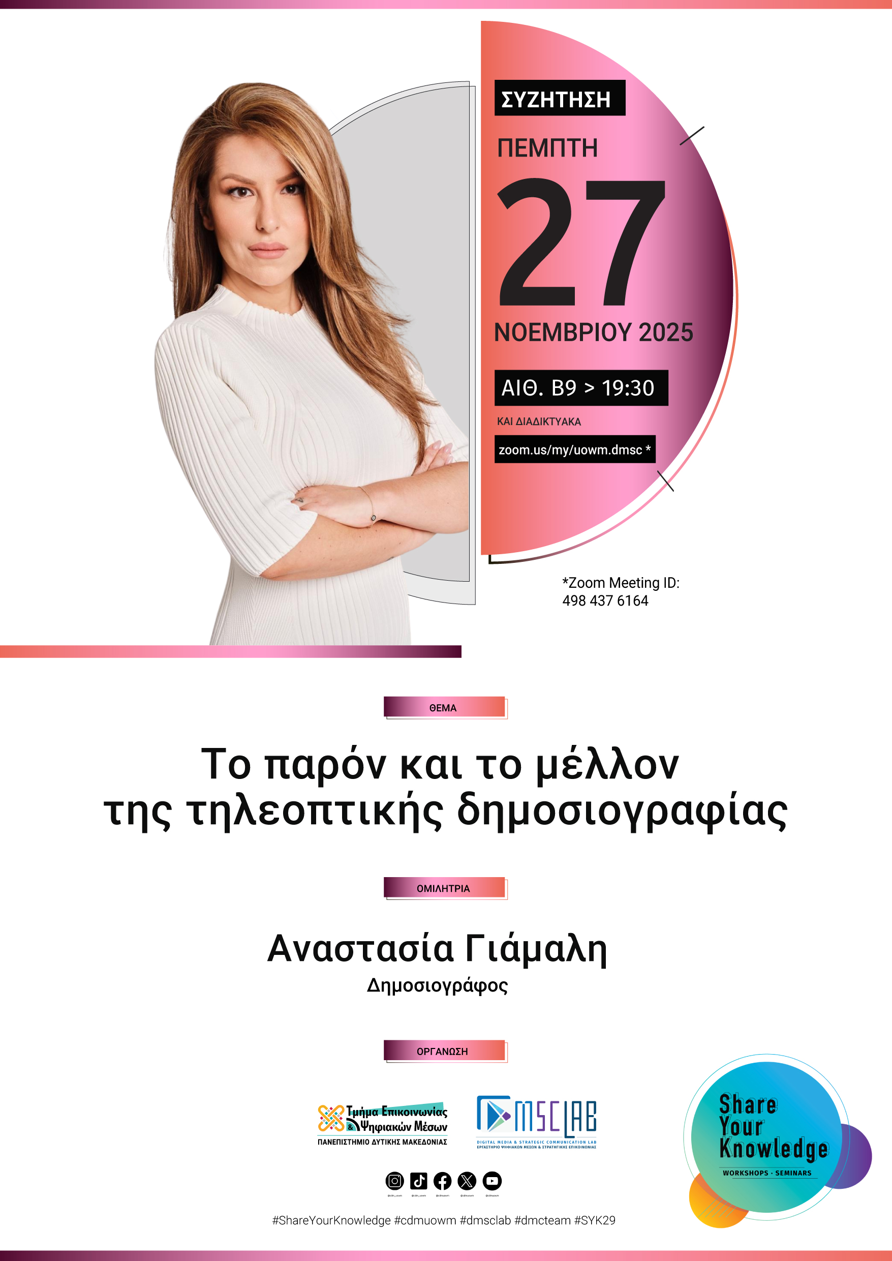 Share Your Knowledge – Μοιράσου τη γνώση σου. Ένας κύκλος σεμιναρίων και εργαστηρίων (workshops) που διοργανώνουν το Εργαστήριο Ψηφιακών Μέσων και Στρατηγικής Επικοινωνίας #dmsclab του Τμήματος Επικοινωνίας και Ψηφιακών Μέσων #cdmuowm και η Ομάδα Επικοινωνίας #dmcteam, με στόχο να φέρουμε κοντά μας επαγγελματίες και ακαδημαϊκούς του χώρου της επικοινωνίας και των ψηφιακών μέσων για να μοιραστούν τις γνώσεις τους μαζί μας. Τα σεμινάρια απευθύνονται σε όλη τη φοιτητική κοινότητα και το ακαδημαϊκό προσωπικό του Πανεπιστημίου Δυτικής Μακεδονίας.